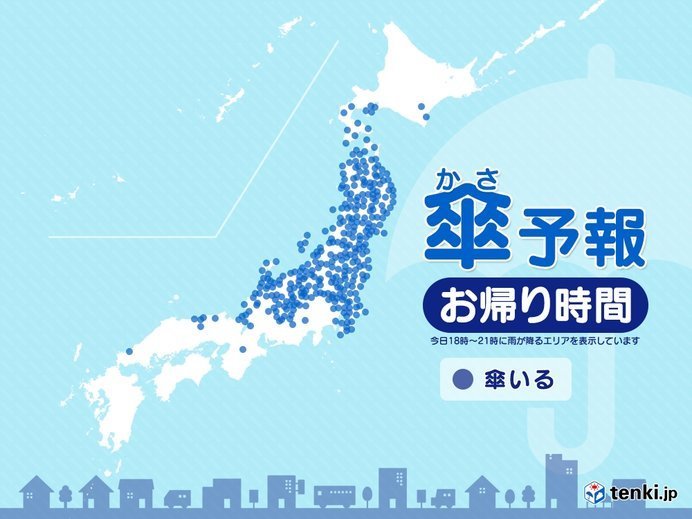 きょう(25日)は本州を通過する低気圧の影響で広い範囲で雨。夜お帰りの時間も関東甲信や東北を中心に雨が降ります。特に関東や東北の太平洋側は雨脚が強く、折り畳みの傘では濡れてしまったり、雨粒の地面への跳ね返りで足元が濡れてしまうかもしれません。大きめの傘やレインコート、レインブーツが大活躍するでしょう。