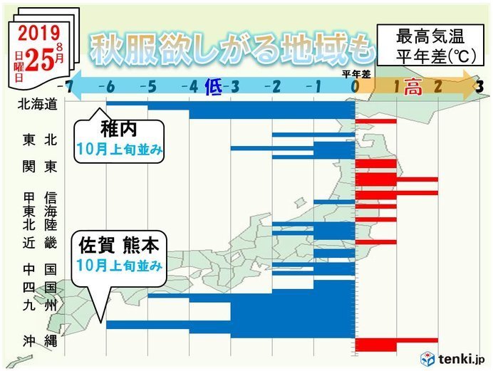 きょうは東京都心や名古屋で気温が30度を超えるなど、関東、東海では所々真夏日になりました。その一方で、北海道はきのうに引き続き、秋の空気に包まれ、多くの地点で25度を下回りました。そしてあす25日、8月最後の日曜日は、北海道だけでなく、西日本でも平年を下回り、九州では一気に衣替えしたくなるような気温の所も。