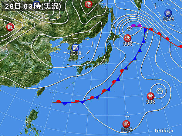 きょう28日朝、関東から九州にかけて、多くの所で晴れています。一方、北陸や東北では、日本海から湿った空気が流れ込んでいるため所々で雨が降り、北海道は東にある低気圧の影響でオホーツク海側を中心に雨の降っている所があります。また、沖縄は、前線に伴う雲に覆われています。