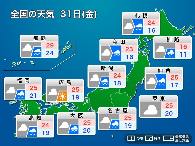 5月最終日の31日(金)は低気圧や前線の通過に伴い全国的に雲が主役の一日です。一時的に雨の降る所が多く、お出かけには傘が欠かせません。