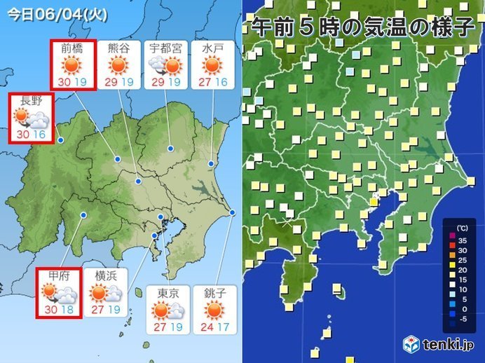 午前4時現在の気温は平野部が17度前後、北部の山沿いは12度前後です。きょう(4日:火曜)の最高気温は28度前後で7月上旬から中旬並みでしょう。前橋では30度まで上がる予想です。内陸部は所々で30度以上の真夏日になるでしょう。湿度は60%以上で経過する所がほとんどで、蒸し暑く感じられそうです。風通しをよくしてお過ごしください。気温も高く、湿度も高いため、食品の取り扱いなどにも十分お気を付けください。なお、午後10時(22時)頃になっても、各地の気温は20度以上もある予想です。