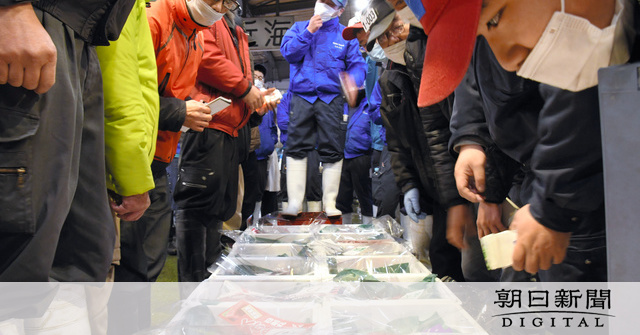 商業捕鯨は昨年、31年ぶりに再開。この日あったクジラの初競りには、イワシクジラの生肉約600キロが出された。「日新丸」(8145トン)を母船とする船団が11月25日に北海道の東沖で捕獲したメス(体長15メートル、体重27トン)からとれたもので、想定よりも2~3割高い1300~5万円で取引された。