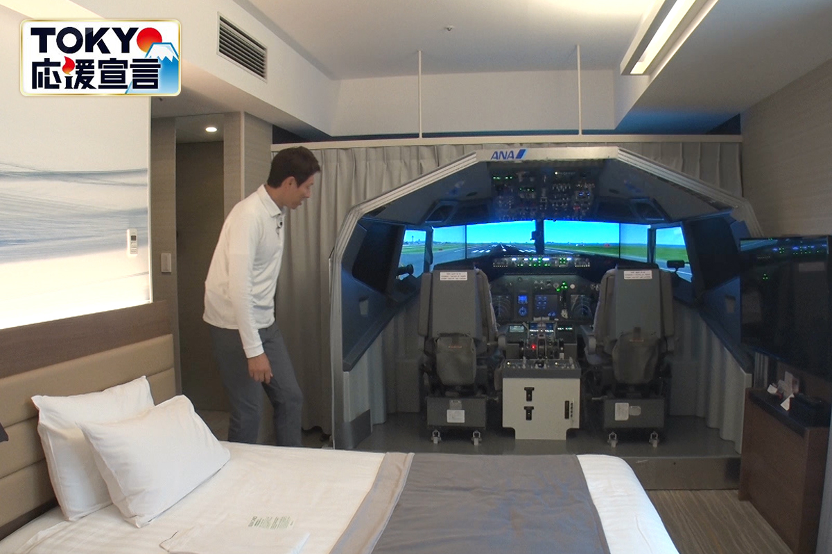 今回、修造が訪れたのは、2020年3月に国際線の増便が予定されている羽田空港第2ターミナルから直結しているホテル。客室をのぞくと、飛行機の操縦席が設置されていた。