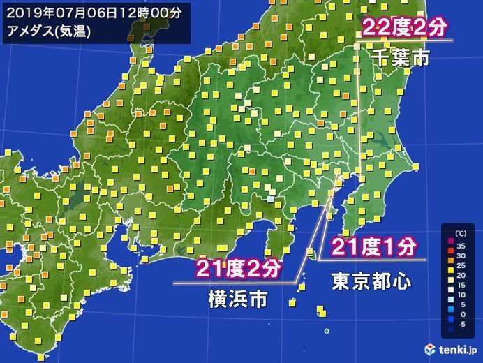 きょう(6日)の関東はオホーツク海高気圧から冷涼な空気が流れ込み、沿岸部を中心に朝から気温が横ばいとなっています。東京都心の正午の気温は21度1分でした。5月中旬並みで、季節が1か月半ほど戻ったような気温です。そのほか正午の気温は横浜市で21度2分、千葉市で22度2分と20度を少し上回る程度となっています。