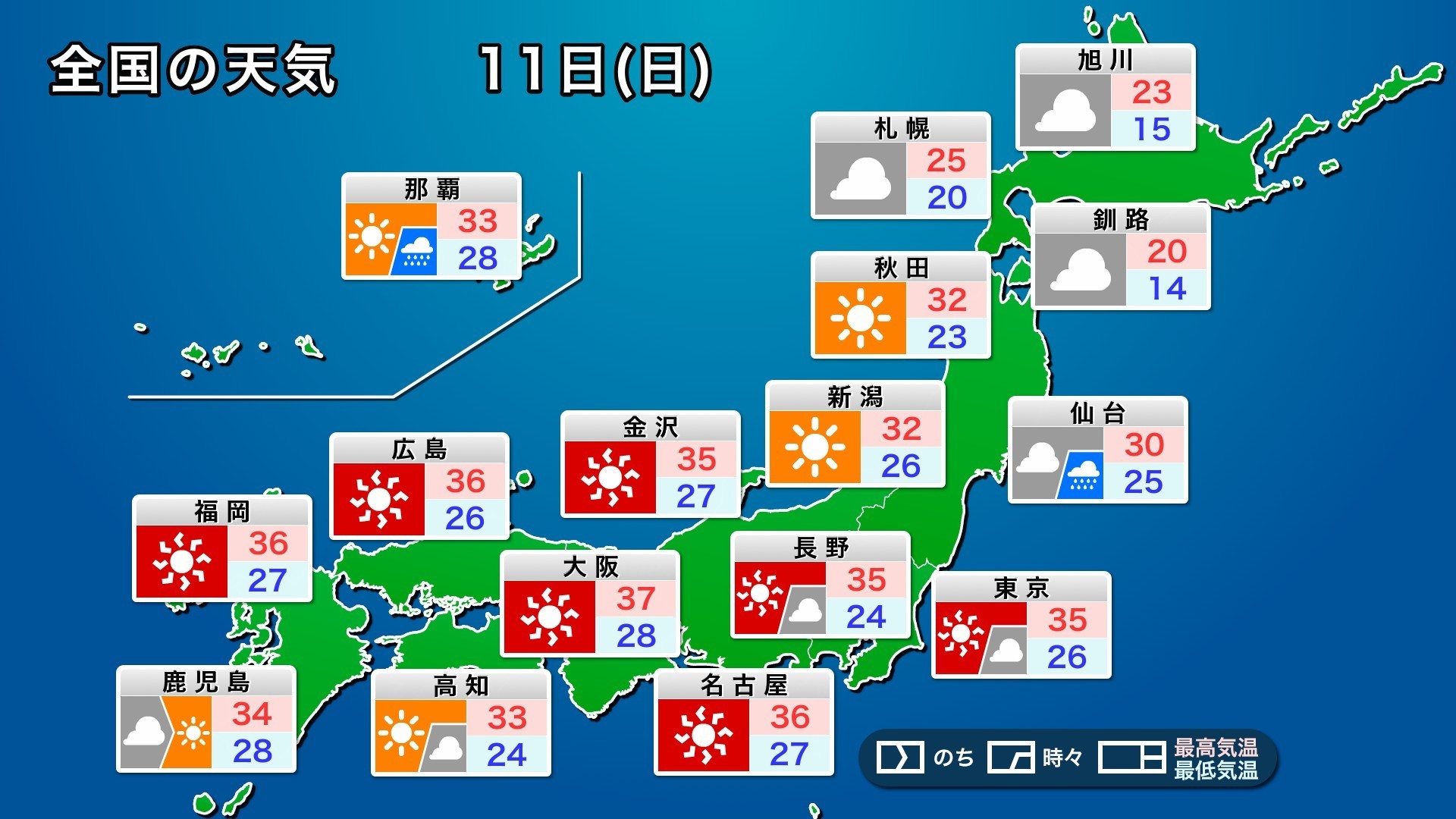 11日(日)は関東から九州にかけては高気圧の圏内となり、広い範囲で晴れる予想です。相変わらずの猛暑になりますので熱中症に警戒をしてください。海に入りたくなる暑さですが、関東から九州や沖縄の沿岸は波の高い状態が続くため、海水浴などは注意が必要です。