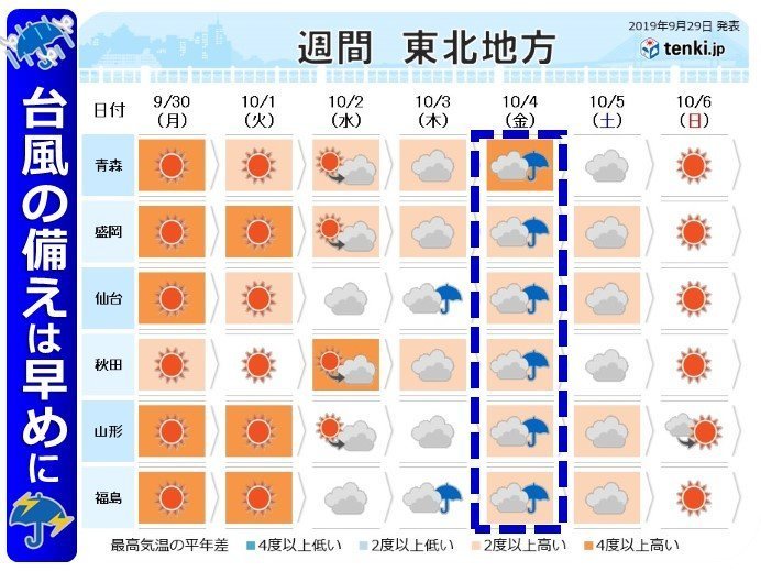 東北地方は2日ごろまで日本海側や北部を中心に晴れますが、天気は下り坂へ。3日から4日は雨が降る予想です。温帯低気圧に変わることで風が強く吹くエリアが広がることがあり、最大風速20m以上の非常に強い風が吹くおそれがあります。まだ予報円が大きく、進路や速度に幅がある状況ですが、備えあれば憂いなし。台風が接近してからでは間に合わない対策もあります。お天気が良いうちに雨や風に対する準備をしておきましょう。