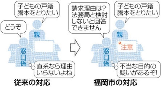 京都女子大の手嶋昭子教授(法社会学)は「ネット社会では戸籍の情報だけで現住所を特定できるリスクは高い。個々の職員の対応に任せるとばらつきが出る可能性があり、職員の負担感も大きくなる。被害者を守るために福岡市のような対応が必要だ」と話している。