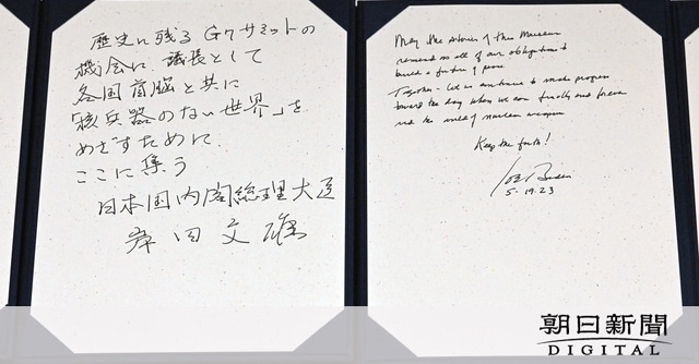 G7首脳らが19日に広島平和記念資料館を訪問した際に記帳した「芳名録」が20日夜、広島市役所で公開された。「世界から核兵器を最終的に、そして、永久になくせる日に向けて、共に進んでいきましょう」(バイデン米大統領)など原爆犠牲者への思いや平和へのメッセージが、肉筆で記されている。