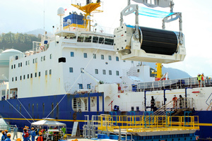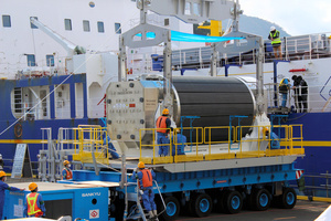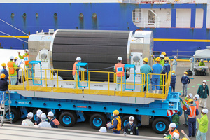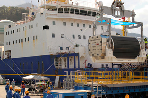 17日朝、原発構内の岸壁に輸送船が接岸。燃料の入った長さ約6・2メートルの輸送容器がクレーンで下ろされ、関電社員と福井県職員が放射線量を測定した。